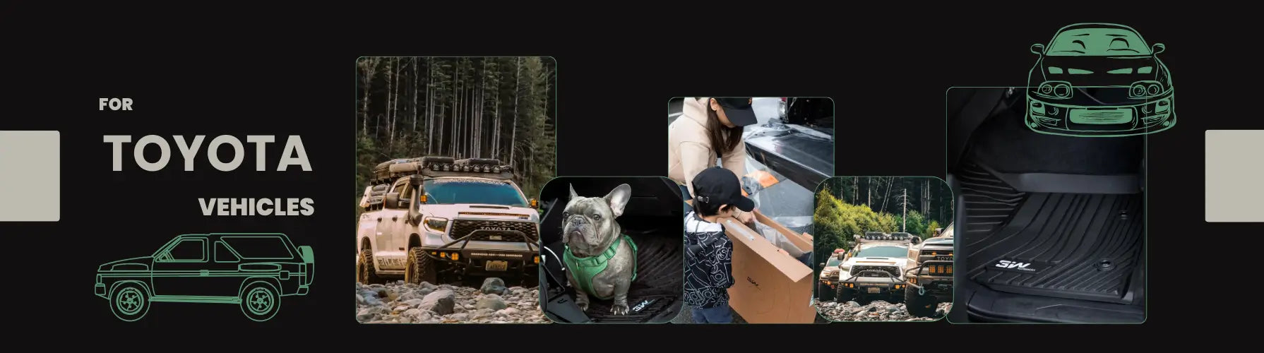 Discover 3W floor mats and cargo liners, meticulously tailored for a range of Toyota vehicles including the Toyota Tacoma, Toyota 4Runner, Toyota Tundra, Toyota RAV4, and Toyota Sienna. These TPE material floor liners and cargo liners offer a perfect fit and comprehensive all-weather protection. Maintain the elegance and cleanliness of your vehicle with Toyota mats that provide edge-to-edge coverage and durability.
