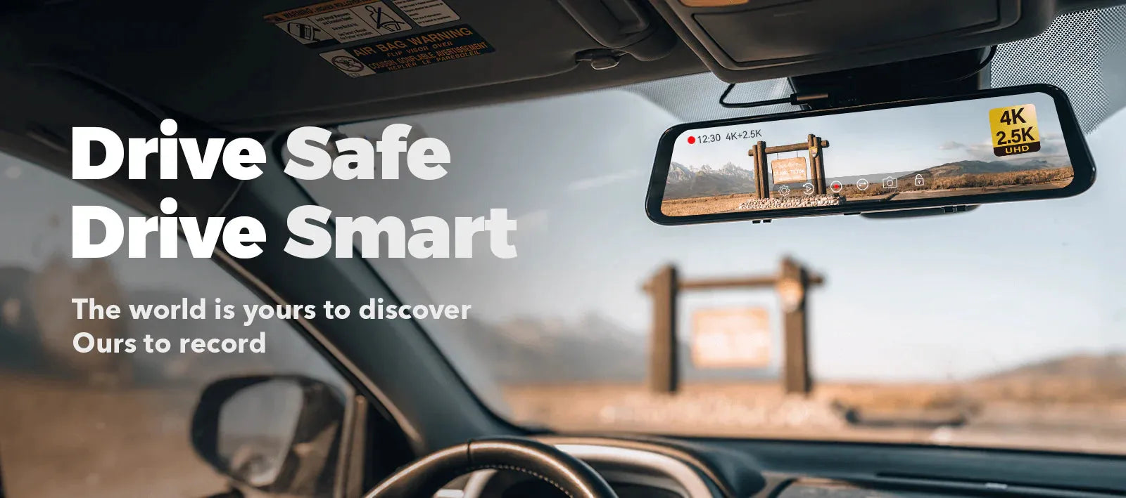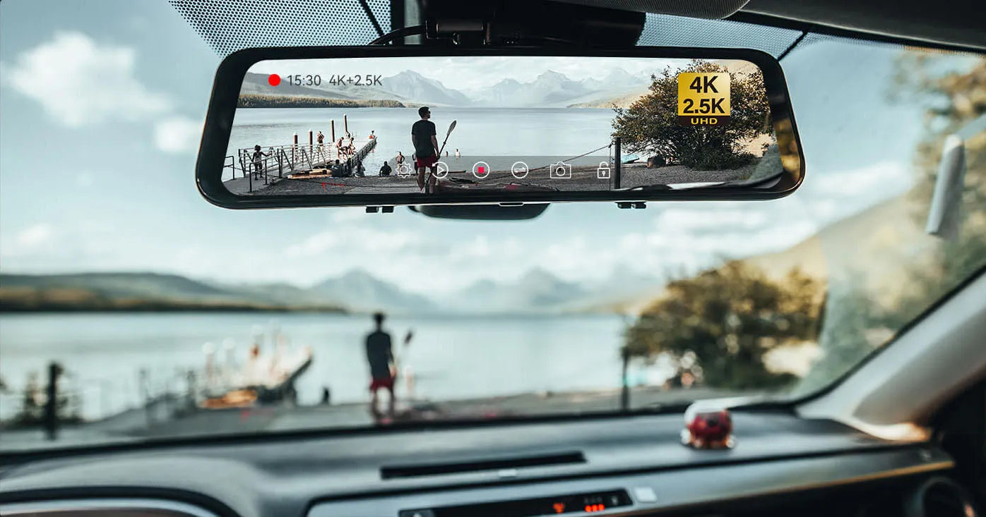 Get the ultimate driving experience with G900 4K+2.5K dashcam featuring a large touchscreen display and rear view mirror cameras.